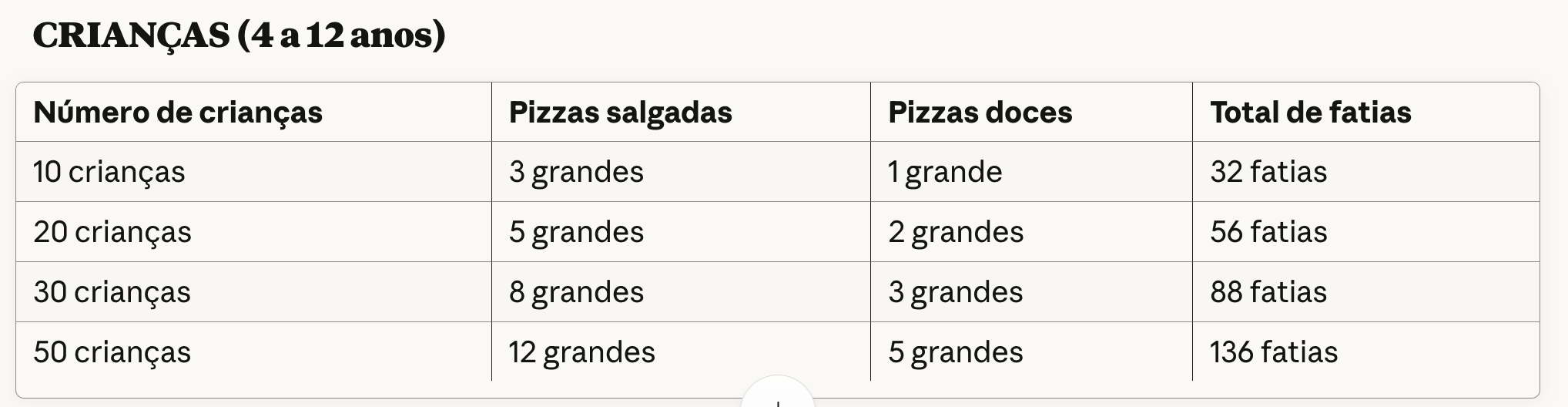 Cálculo base: 2 a 3 fatias de pizza salgada + 1 a 2 fatias de pizza doce por criança