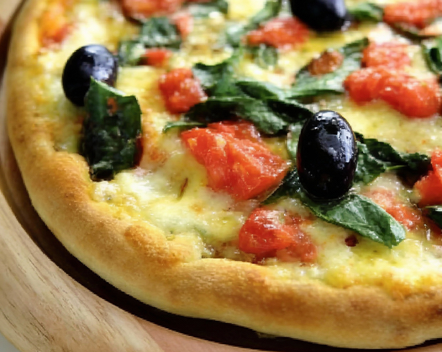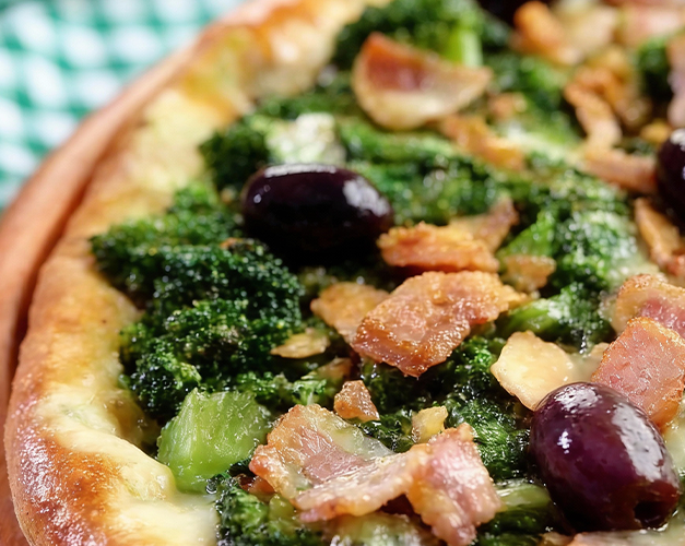 Muçarela, brócolis, bacon, alho frito, molho de tomate natural, azeitona preta e orégano.