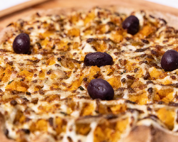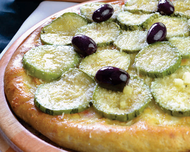 Muçarela, abobrinha, parmesão, molho de tomate natural, azeitona preta e orégano.
