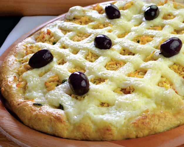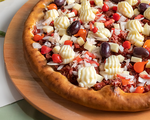 Catupiry original, frango desfiado, calabresa, bacon, molho de tomate natural, azeitona preta e orégano.