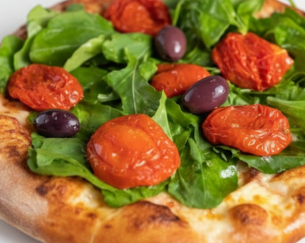 Muçarela, rúcula, tomate seco, molho de tomate natural, azeitona preta e orégano.