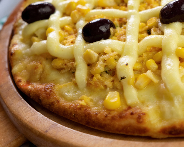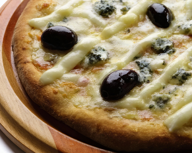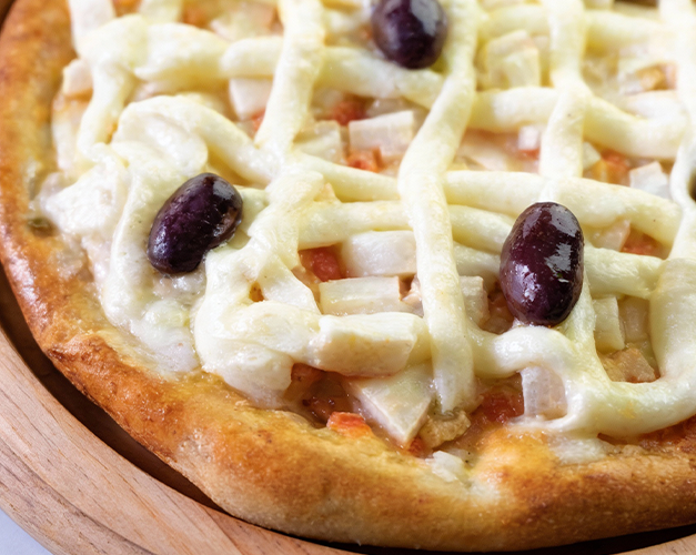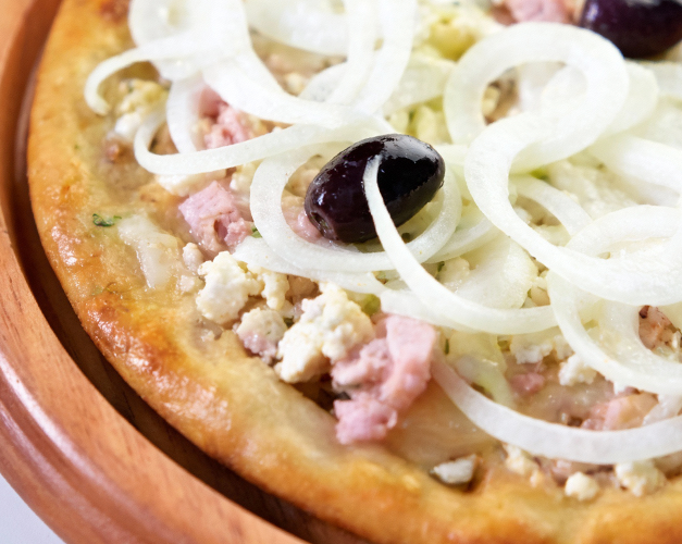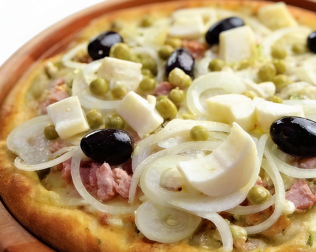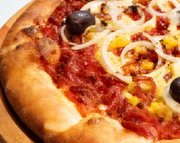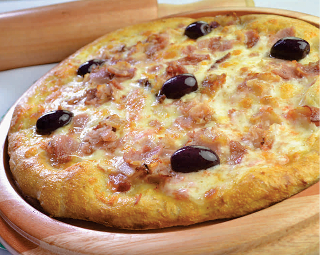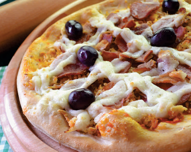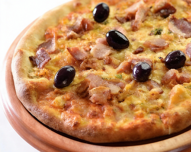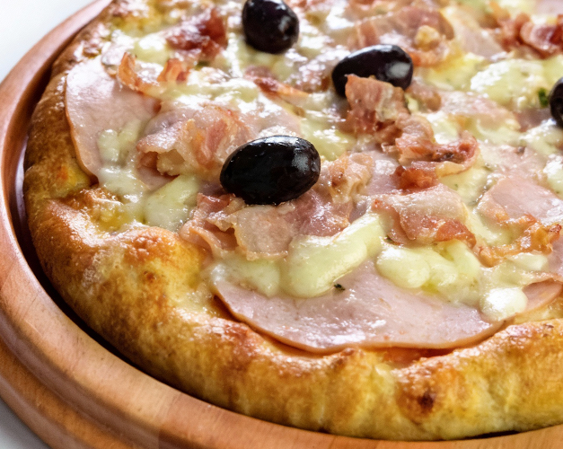 Muçarela, bacon, molho de tomate natural, azeitona preta e orégano.