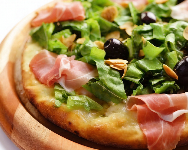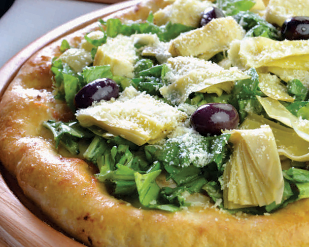 Muçarela, coração de alcachofra, rúcula, parmesão, molho de tomate natural, azeitona preta e orégano.