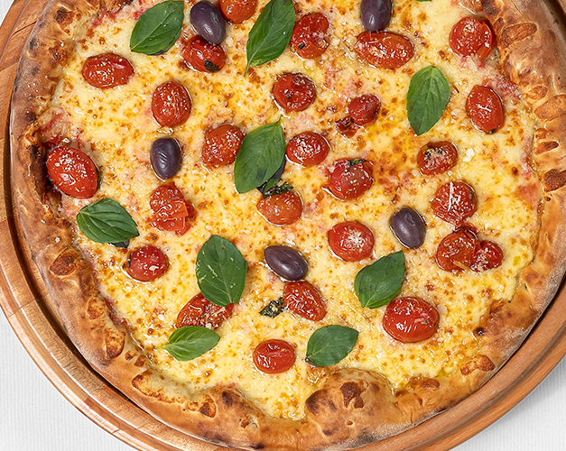 Muçarela, muçarela de búfala em pedaços, manjericão, rodelas de tomate, molho de tomate natural, azeitona preta e orégano.