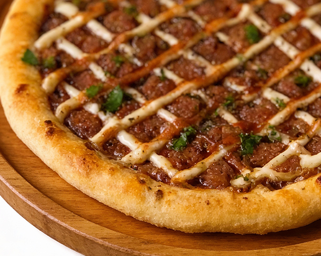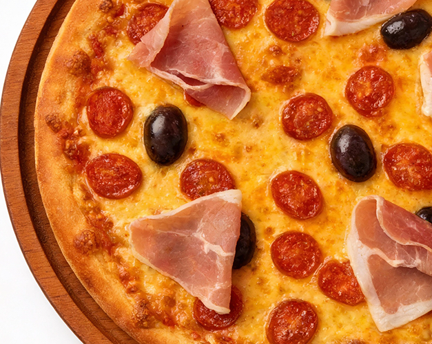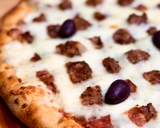 Muçarela, calabresa, bacon, molho de tomate natural, azeitona preta e orégano.