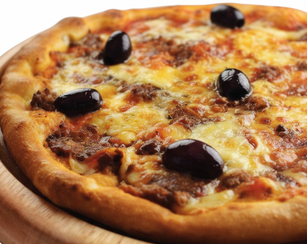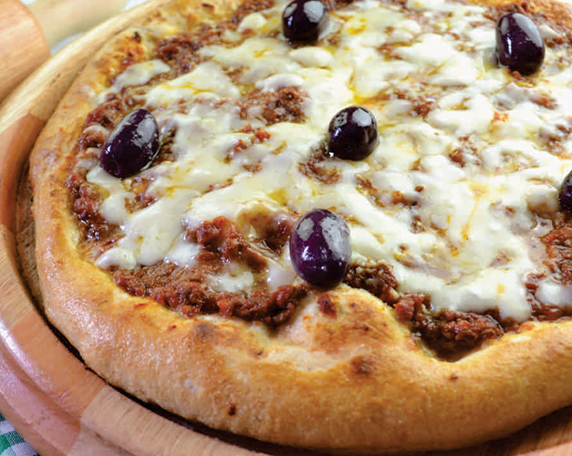 Muçarela, carne moída de 1a qualidade, parmesão, azeitona preta e orégano.