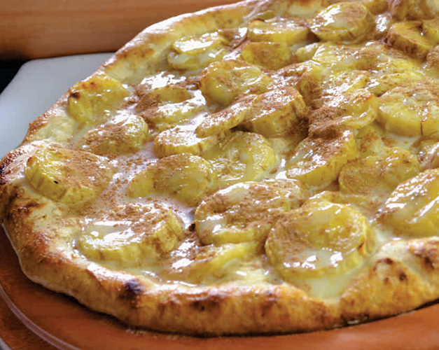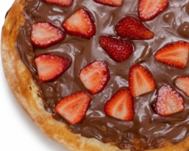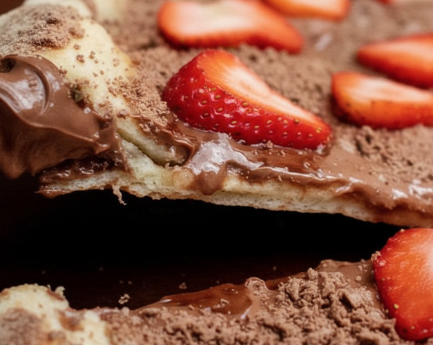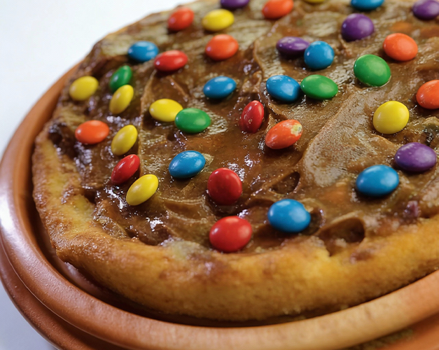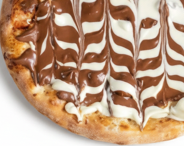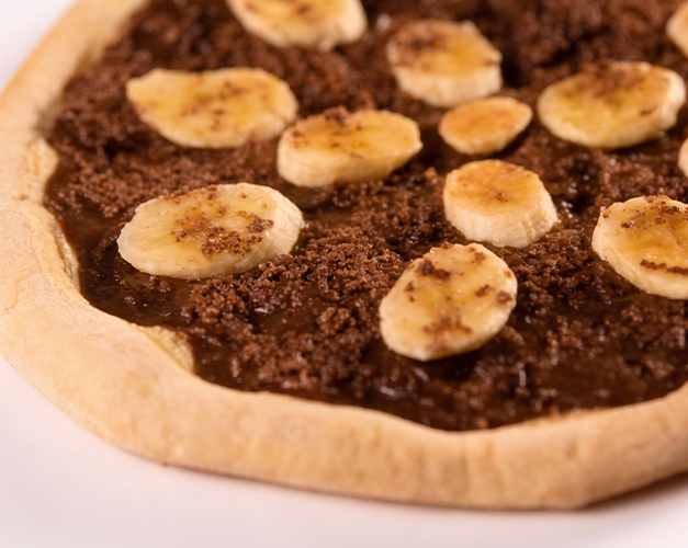 Pizza doce com creme de Ovomaltine, finalizado com creme especial de leite Ninho.