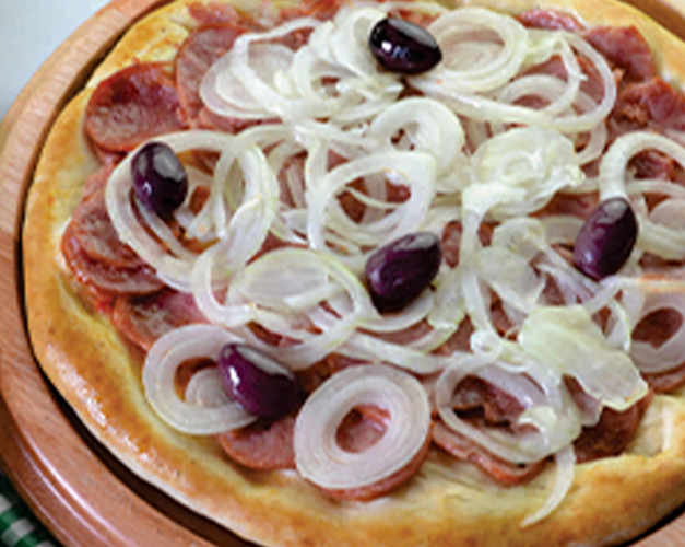 Muçarela, calabresa moída, cebola, molho de tomate natural, azeitona preta e orégano.