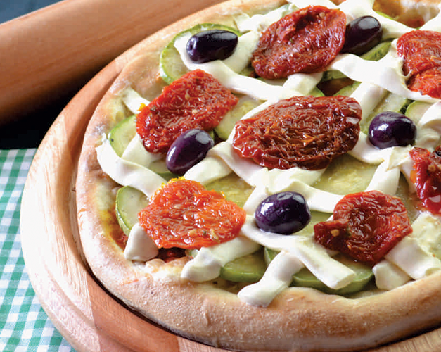 Cream cheese Philadelphia, abobrinha, tomate seco, molho de tomate natural, azeitona preta e orégano.