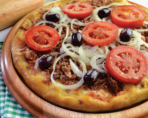 Muçarela, carne seca desfiada, cebola, rodelas de tomate, molho de tomate natural, azeitona preta e orégano.