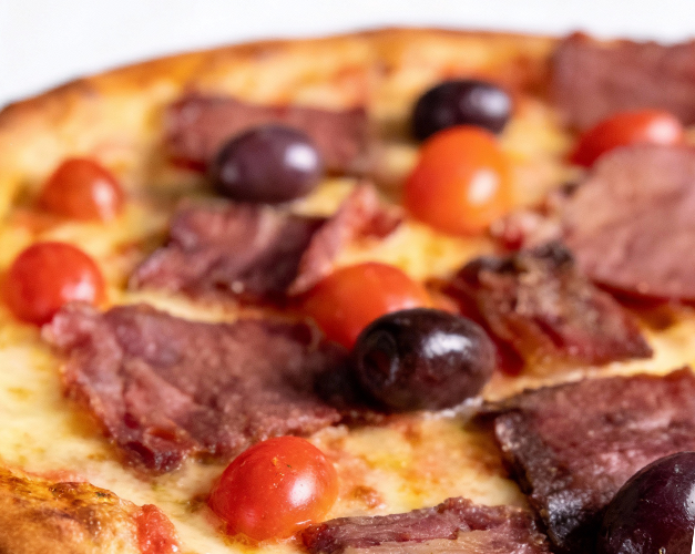 Costela bovina fatiada, rodelas de tomate, molho de tomate natural, azeitona preta e orégano.