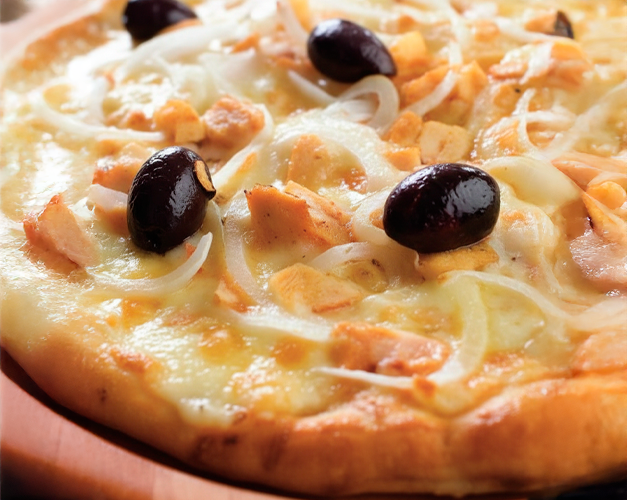 Muçarela, frango desfiado, bacon, molho de tomate natural, azeitona preta e orégano.