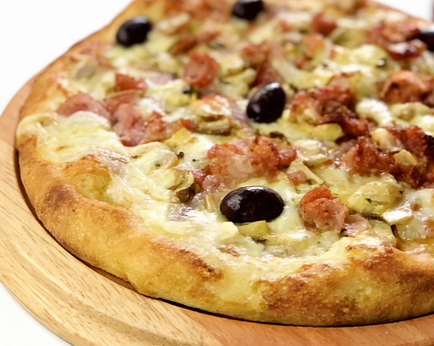 Muçarela, champignon, bacon, molho de tomate natural, azeitona preta e orégano.