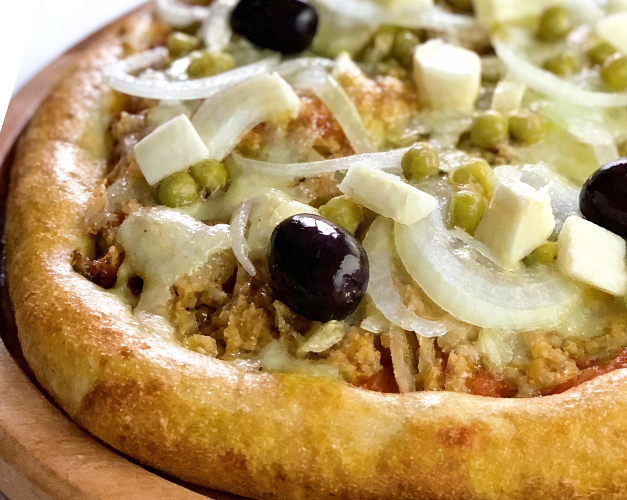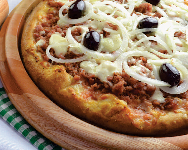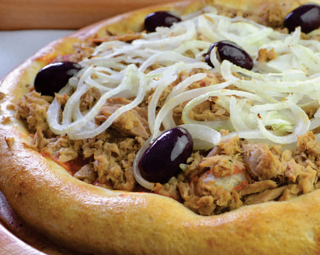 Atum, cebola, molho de tomate natural, azeitona preta e orégano.