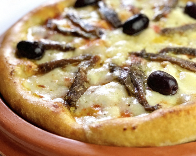 Aliche, parmesão, rodelas de tomate, molho de tomate natural, azeitona preta e orégano.