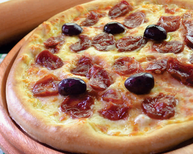 Muçarela, calabresa artesanal levemente apimentada, molho de tomate natural, azeitona preta e orégano.