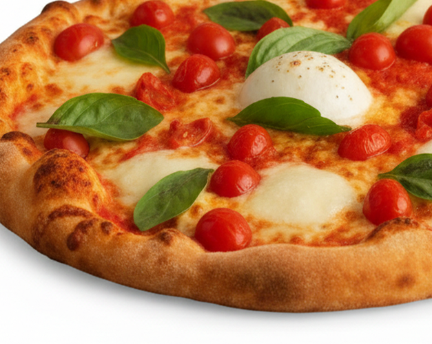 Molho de tomates frescos, muçarela de búfala, bolas de muçarela de búfala especial, tomates cereja, folhas de manjericão fresco, azeitona preta e orégano.